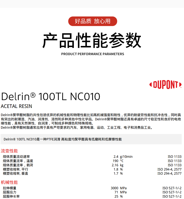 POM 100TL NC010 低摩擦 低磨耗 高粘度 美国杜邦 聚甲醛